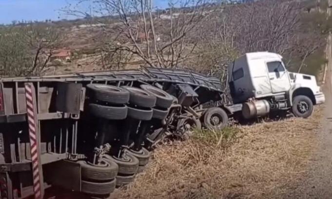 Caminhão carregado de postes capota na rodovia próximo ao Açude Velho, em Imaculada