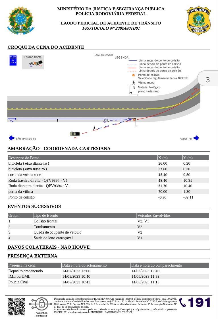 NARRATIVA No dia 14/05/2023, por volta das 10h15, no Km 316,3 da BR 230, em São Mamede-PB , ocorreu um acidente do tipo colisão frontal, seguida de saída do leito carroçável de V1, e tombamento, queda de ocupante e morte de condutor de V2. Os envolvidos foram um automóvel VW/NOVA SAVEIRO PP MBVD ( V1 ) e uma bicicleta cuja marca não foi identificada ( V2 ). Com base na análise das evidências identificadas ( danos na lataria e para-brisas de V1 e danos em toda a estrutura de V2) , constatou-se que V1 transitava na via no sentido PATOS/SÃO MAMEDE da rodovia quando invadiu a contramão de direção e colidiu frontalmente com V2 que seguia no acostamento da via no sentido SÃO MAMEDE/PATOS.