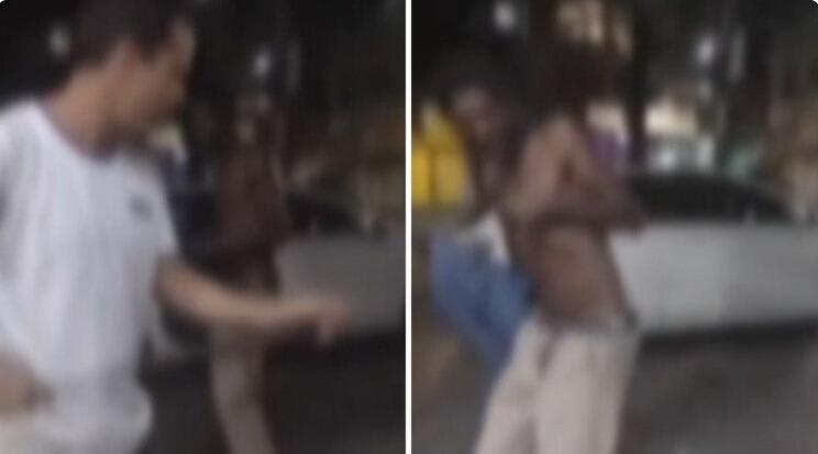 Nas imagens, o suspeito, vestindo camisa branca, oferece dinheiro ao homem em situação de rua para dar dois golpes de cinto em suas costas. Durante a gravação, ele afirma: