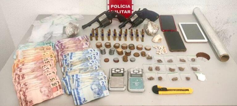 Com os suspeitos foram encontrados dois revólveres, calibre 38, com 18 munições intactas, 16 porções de maconha, 22 pedras de crack, uma porção de crack, uma porção de cocaína, balanças de precisão, dinheiro e várias embalagens para a venda da droga, caracterizando o local como um possível ponto de tráfico.