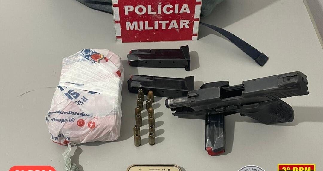 Policiais militares da Rádio Patrulha do 3º BPM, com o apoio do BOPE, prenderam dois homens na noite desta terça-feira, dia 22, no bairro Dona Milindra, com uma arma de fogo e um tablete de uma substância análoga a maconha.