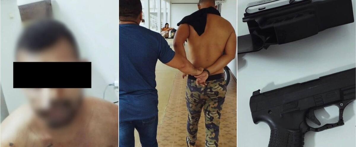 No local, as autoridades encontraram um simulacro de arma de fogo, indicando possíveis intenções criminosas por parte do detido.