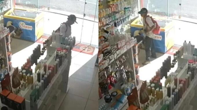 Um homem trajando calça preta, camisa branca e boné, portando uma mochila, entra na farmácia, dirige-se rapidamente a uma das prateleiras, de onde subtrai produtos como shampoo e sabonete, escondendo-os na roupa. Não satisfeito, o ladrão se aproxima de um freezer e furta até sorvetes para depois amenizar o calor.