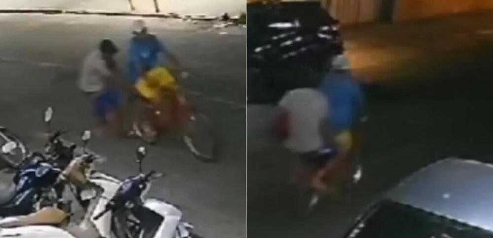 Imagens de câmeras de segurança mostram o momento em que os suspeitos chegam em uma bicicleta. Um dos homens desceu, abordou a vítima que estava para entrar em seu apartamento e, armado com uma faca, a ameaçou, roubando o celular.