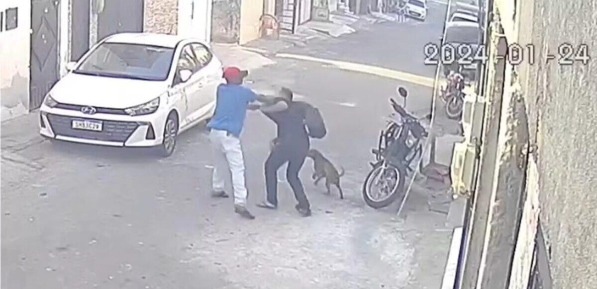 Depois de iniciarem uma discussão, os dois trocam socos. O homem de preto, então, saca a arma de fogo e dispara. Porém, o rival reage e pega a mesma arma que o atingiu e atira. Ao todo, foram efetuados seis disparos.