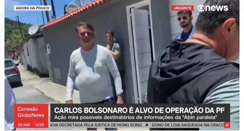 Durante um trecho da cobertura feita pela reportagem da Globo News na frente da casa da família Bolsonaro em Angra é possível ver imagens de Carlos Bolsonaro e do seu pai deixando a casa acompanhados por agentes da Polícia Federal. Após a saída das imagens é possível ver que Bolsonaro e seus filhos ainda ficam um tempo diante da casa após a saída dos agentes da Polícia Federal.