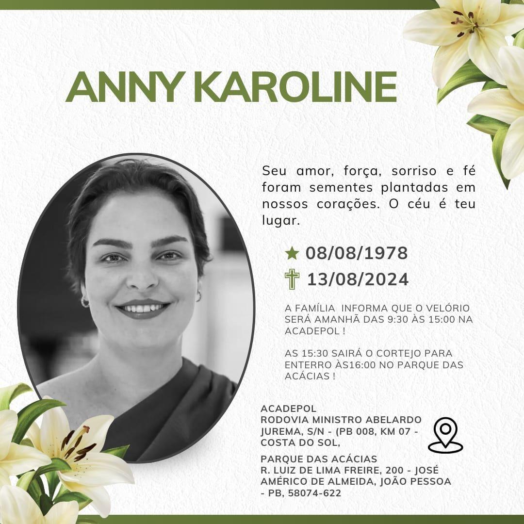 Faleceu ontem (13) aos 46 anos a delegada de Polícia Civil Anny Karoline Carneiro Maciel. A informação foi divulgada pela PCPB por meio da assessoria de imprensa.