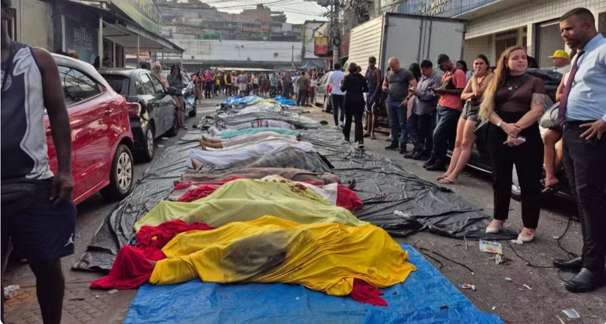 Moradores do Complexo da Penha, na Zona Norte do Rio de Janeiro, levaram pelo menos 50 corpos para a Praça São Lucas, na Estrada José Rucas, uma das principais da região, ao longo da madrugada desta quarta-feira (29), o dia seguinte à operação mais letal da história do RJ.