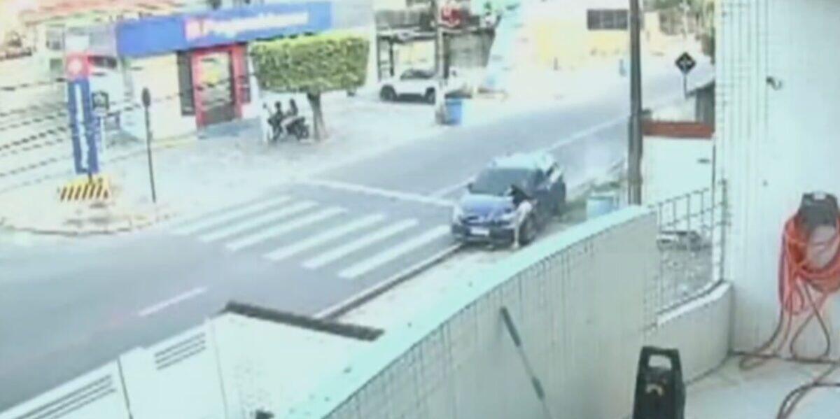 Imagens do circuito de segurança registraram todo o momento. O carro sai da faixa, atropela e zelador e sobe na calçada da avenida Afonso Pena, a principal do bairro.