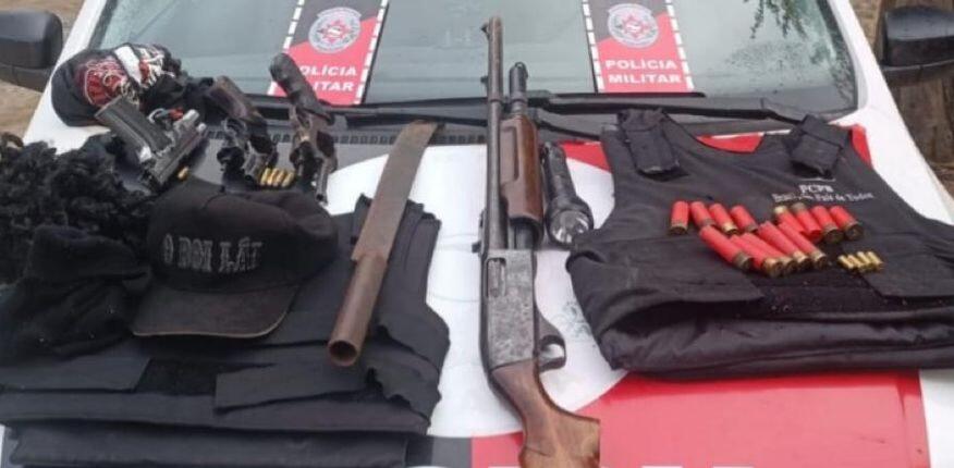 De acordo com a polícia, foi apreendido quatro armas de fogo, sendo uma escopeta calibre “12”, dois revólveres e uma pistola, além de munições e dois coletes balísticos.