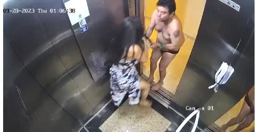 As imagens registradas pela câmera de segurança mostram o homem em luta corporal com a mulher, arrastando a mulher para fora do elevador, segurando-a pelo cabelo.