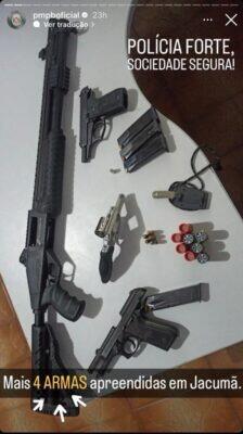 A Polícia Militar recebeu uma denúncia anônima informado que pessoas estavam armadas circulando em uma van na região do Conde. Durante a abordagem, os militares encontraram quatro armas de fogo; uma escopeta calibre 12, duas pistolas e um revólver calibre “38”, além de munições.