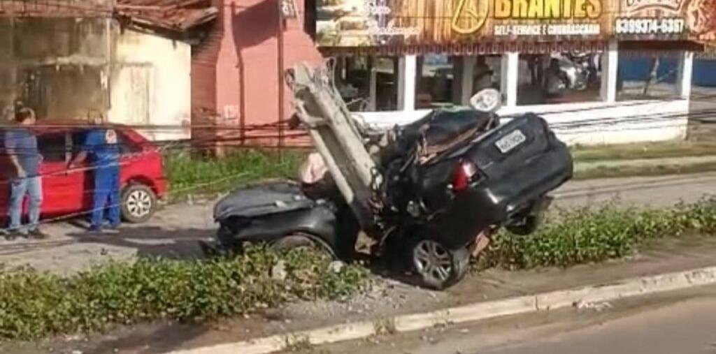 [VÍDEO] Mulher escapa por pouco de acidente que destruiu carro e poste e deixou um morto