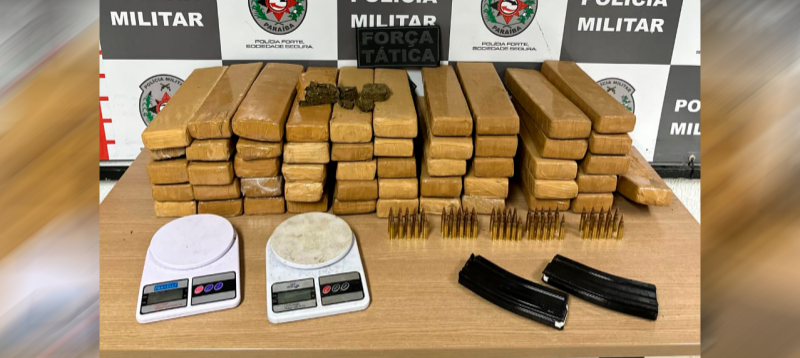 Na localidade, em uma área de mata, foram encontrados mais de 52 tabletes de maconha, 2 balanças de precisão, 2 carregadores e 50 munições de fuzil, calibre 556, que é de uso exclusivo das forças de segurança. Na ocorrência, nenhum suspeito foi localizado. Todo material apreendido foi encaminhado à Central de Flagrantes pelas equipes do 1º BPM.