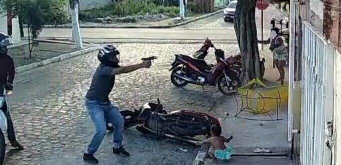 No vídeo, é possível ver três homens, duas mulheres e a criança em uma calçada. Em seguida, outros dois homens chegam ao local de moto, já atirando contra as vítimas. Os adultos entram na residência para escapar dos tiros, e a menina fica na calçada.