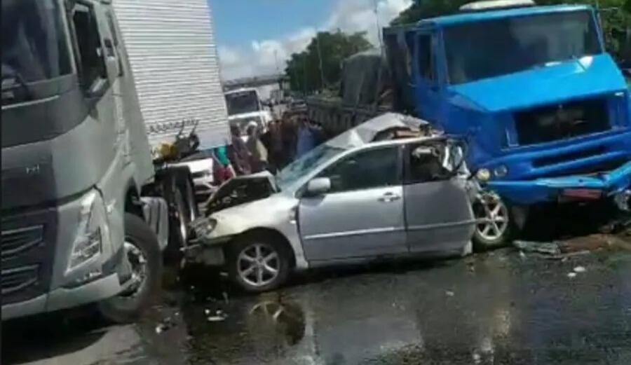 Carro é esmagado entre caminhões em acidente na BR-101
