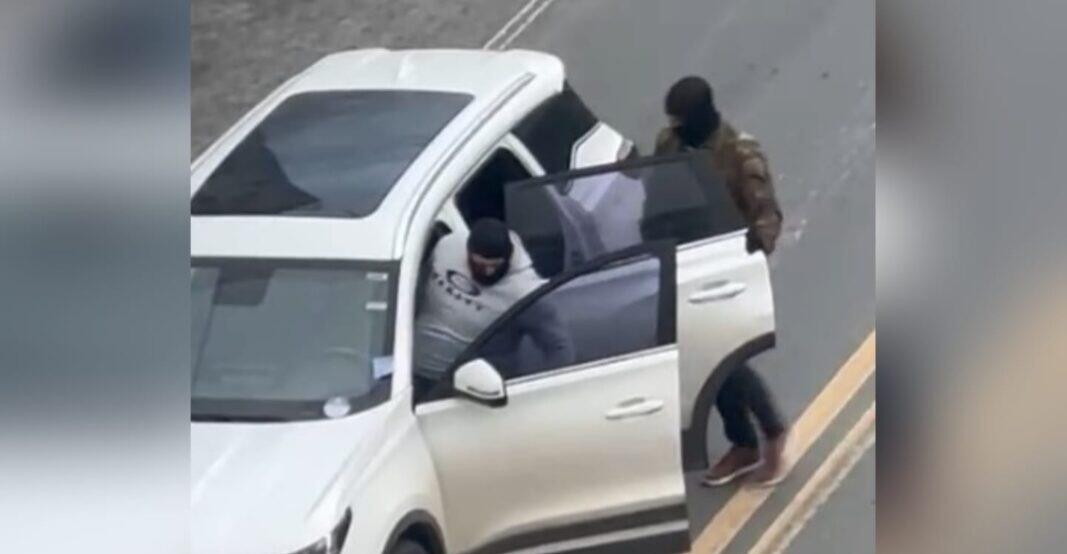 No vídeo (assista abaixo), é possível ver a mulher sendo parada por um dos criminosos. Outros três homens se aproximam do carro. Um deles apoia o colega ferido. Os quatro entram no carro e fogem enquanto a mulher rendida pega o celular no automóvel e vai para a calçada.