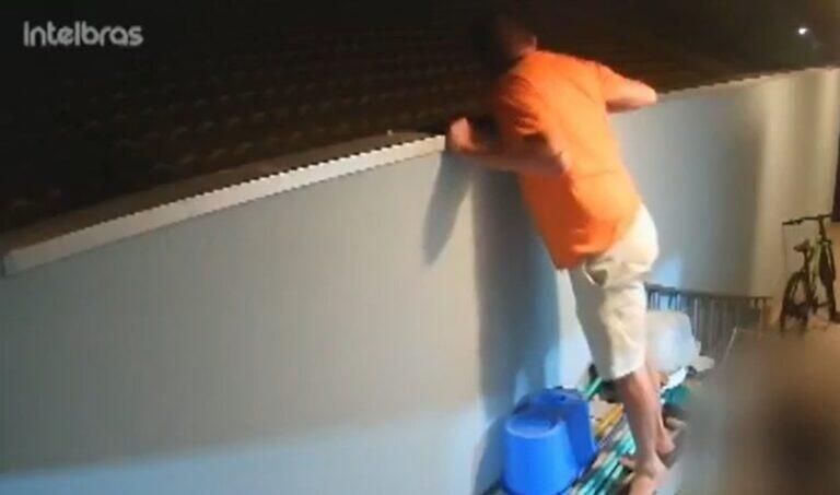 Imagens de câmera de segurança registraram o momento em que Bruno Júnior, de 33 anos, foi morto com um tiro no rosto depois subir no muro de casa, no distrito de Pirapó, em Apucarana, norte do Paraná.