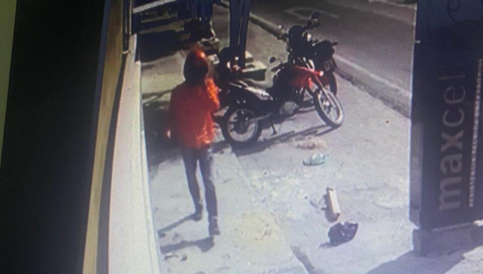A ação durou poucos minutos, dois no máximo, e é quando o comparsa entra na loja de capacete e começa a fazer o arrastão pegando celulares e colocando numa sacola.