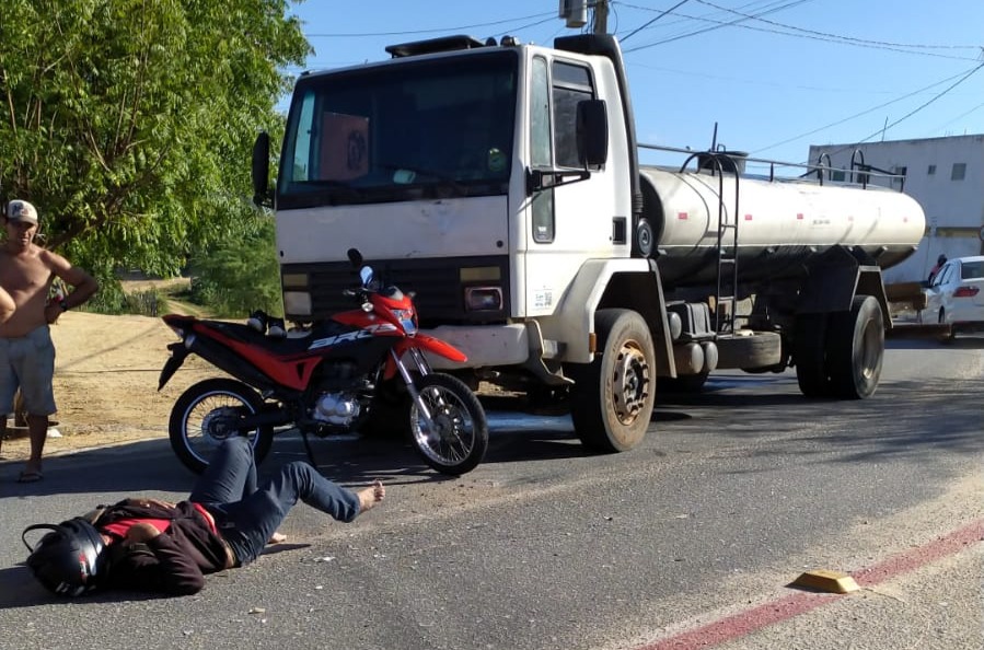 Um caminhão-pipa provocou um grave acidente na manhã desta quarta-feira (29), nas proximidades da Universidade Federal de Campina Grande, no bairro Jatobá, em Patos-PB. O sinistro envolveu o caminhão e um motociclista que trafegava no sentido bairro-centro, pela via correta.