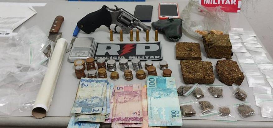 Com a confissão, os policiais fizeram mais buscas e encontraram drogas, moedas, além de uma arma de fogo, um revólver calibre 38, com 06 munições intactas. O suspeito, que já tem passagem pela polícia por tráfico e roubo, alegou que a arma era para sua defesa.
