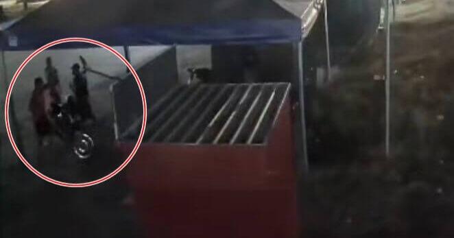 Uma câmera de segurança flagrou toda a ção e pelas imagens é possível observar que o jovem estava parado com a moto, modelo Honda Fan vermelha, placa KFA-3270, embaixo de uma tenda e mexendo no celular, momento em que dois indivíduos se aproximam.
