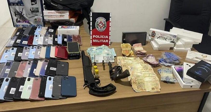 Duas pessoas são presas com armas, 57 celulares e mais de R$ 11 mil roubados