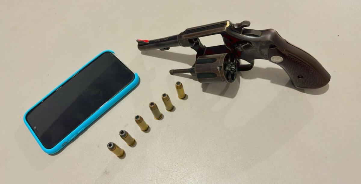 Durante a abordagem, na execução da busca pessoal ao condutor, foi encontrado em sua cintura um revólver calibre 38, oxidado, com 6 munições intactas de mesmo calibre e um celular IPhone 11 de cor branca.