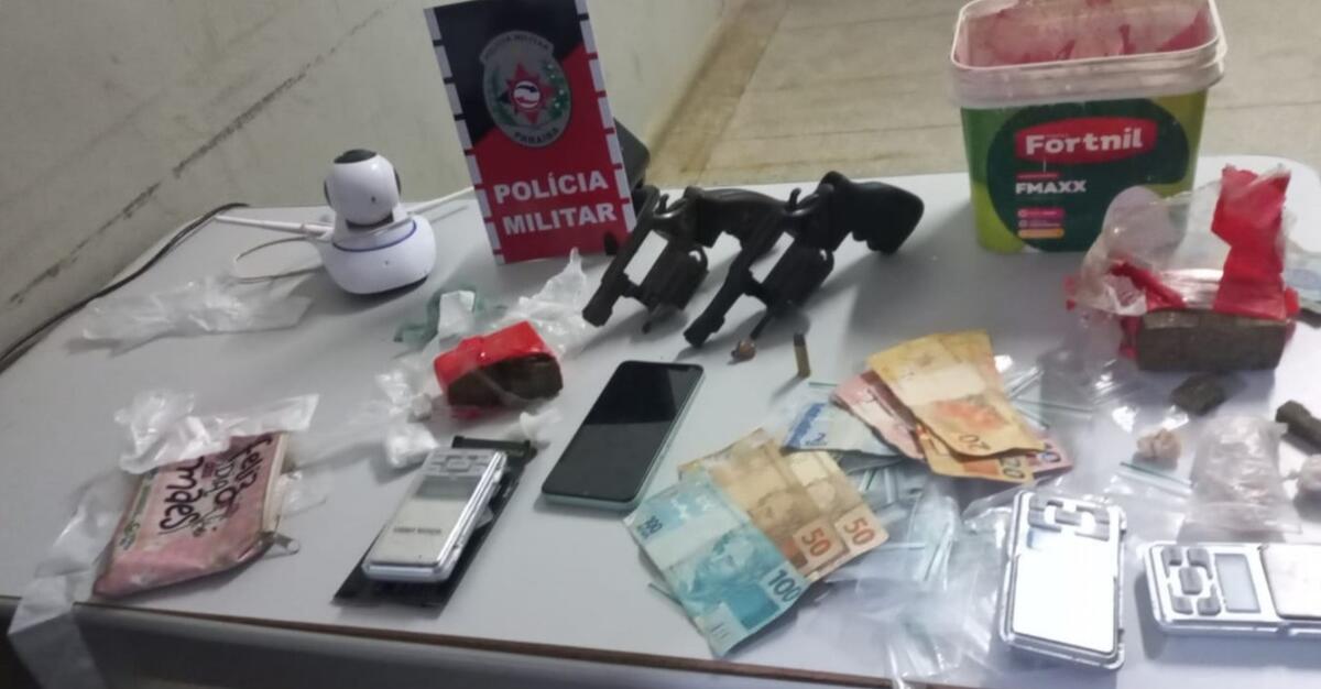 Ao fazer uma varredura na casa onde ele se encontrava, foi apreendida uma arma de fogo calibre .38 da marca Taurus, 41 gramas de uma substância análoga a cocaína, um tablete de uma substância análoga a maconha, 45 gramas de uma substância análoga a crack, duas balanças de precisão e trezentos e cinquenta e sete reais (R$ 357,00) em dinheiro.