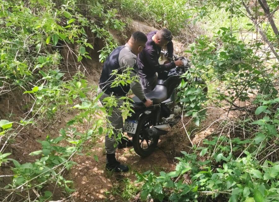 Ao chegar no local, foi encontrada a motocicleta dentro do mato e foi constatado que seria a moto que havia sido roubada durante a madrugada.
