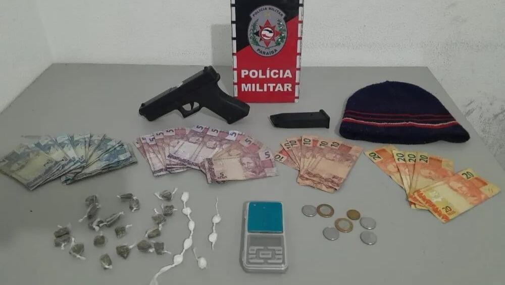 Após uma busca detalhada na residência, os policiais encontraram 19 porções de uma substância semelhante a maconha, 8 porções de um pó branco, possivelmente cocaína, uma balança de precisão, um simulacro de pistola, além de uma quantia em dinheiro. O suspeito detido negou ser o proprietário dos itens, alegando que pertenciam ao indivíduo que conseguiu fugir.