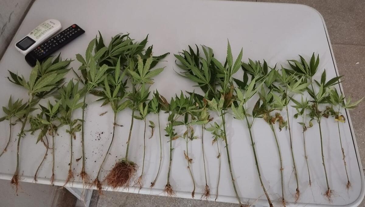 Durante as diligências no local, os policiais identificaram 20 (vinte) pés de maconha plantados no quintal da casa. A companheira do suspeito informou que ele é usuário e envolvido com o tráfico de entorpecentes.
