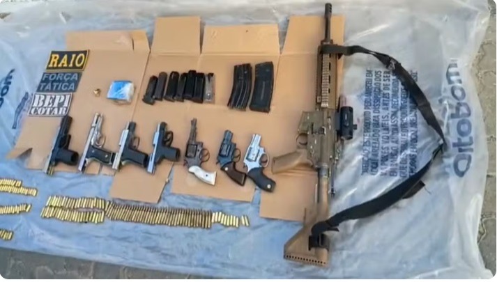 Com o bando, os policiais apreenderam fuzis, pistolas, revólveres, granadas, um veículo e dezenas de munições.