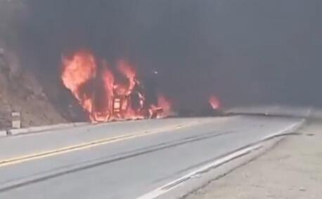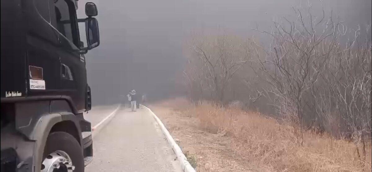 As imagens registradas no local do acidente mostram o caminhão pegando fogo e uma fumaça muito se espalhou rapidamente. A fumaça dificulta a visibilidade dos condutores e impede o trânsito na área.