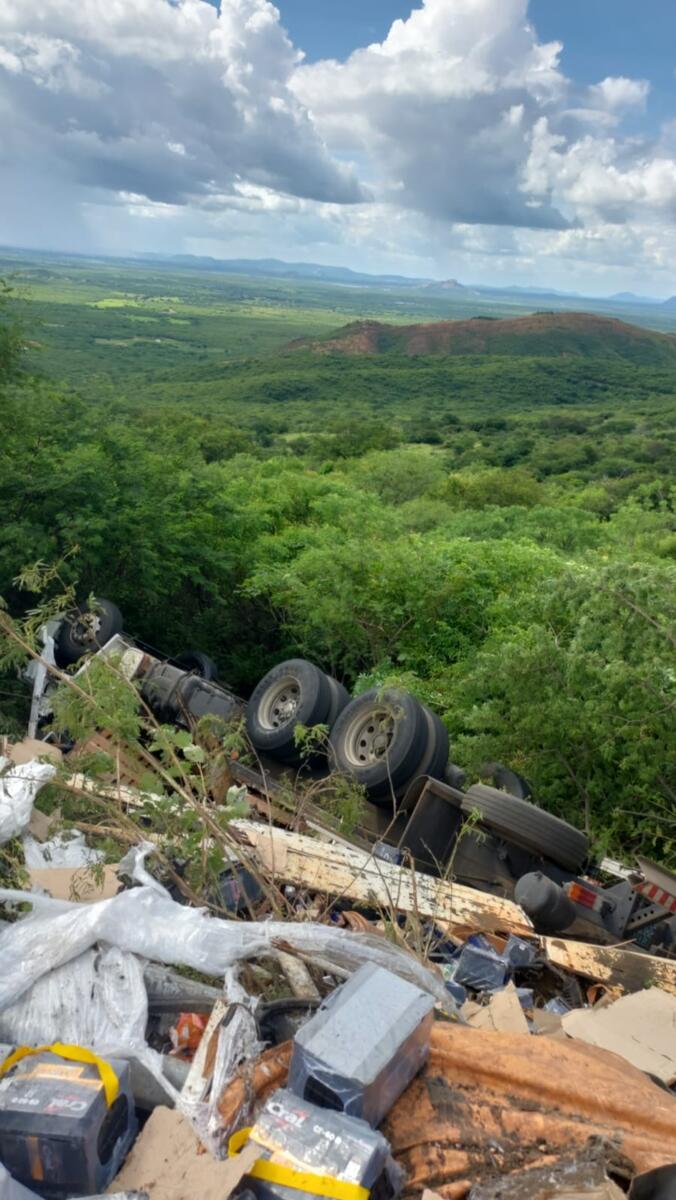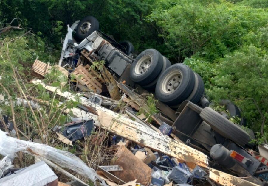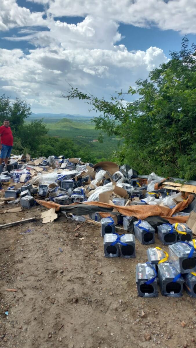 Caminhão carregado de baterias tomba na Serra de Teixeira; motorista morre e parte da carga é saqueada