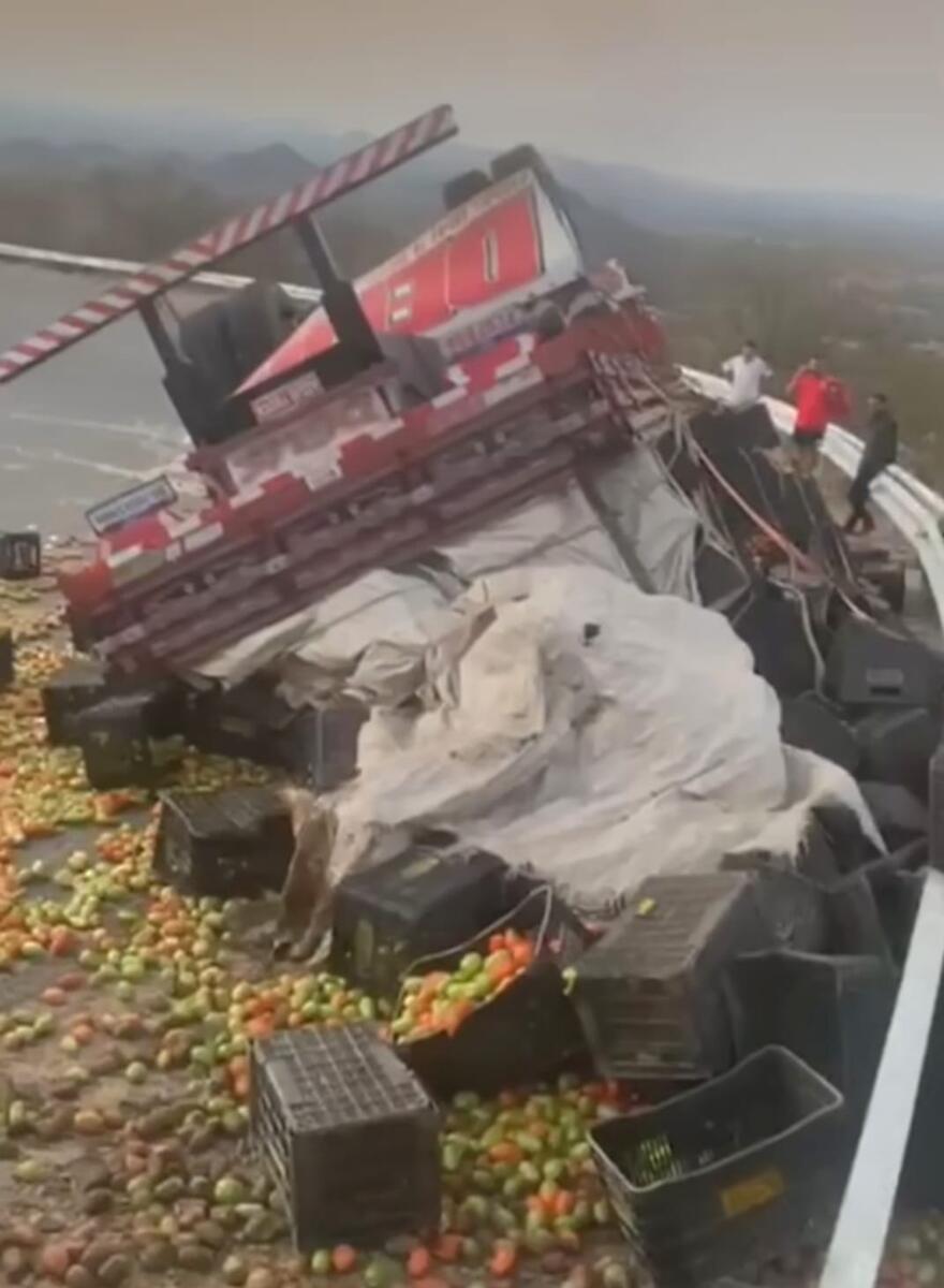 [VÍDEO] Caminhão carregado com tomates tomba na Serra de Teixeira