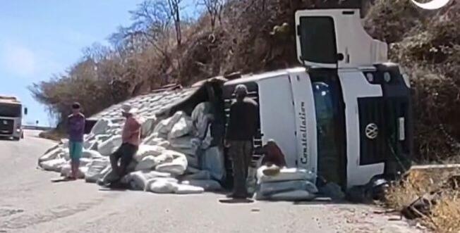 Um caminhão de placas OFC-7E14 carregado com sacolas plásticas tombou na manhã desta quinta-feira (05), na PB 262, na Serra do Teixeira, na Região Metropolitana de Patos.