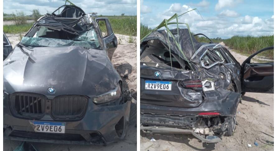 O capotamento da BMW aconteceu nas proximidades da entrada para uma produção de água mineral. Ainda não se tem informações sobre o que teria causado o sinistro.
