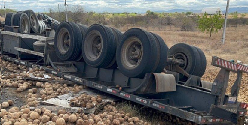 A PRF informou que tanto o caminhão quanto a carga estão fora da pista, e o trânsito no local segue sem alterações.