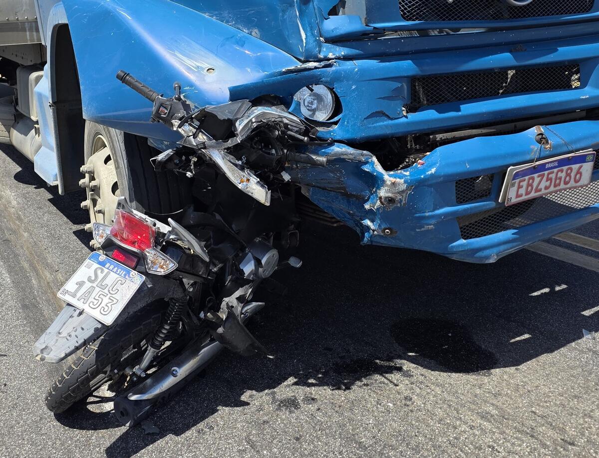A colisão foi tão grande que a moto ficou presa embaixo do caminhão, como mostram as imagens, e o condutor da motocicleta foi parar metros à frente. O capacete se soltou com a força da colisão. Pelas marcas da colisão na lataria do caminhão, dá para perceber que o motociclista voou e bateu com a cabeça na parte superior do capô do caminhão.