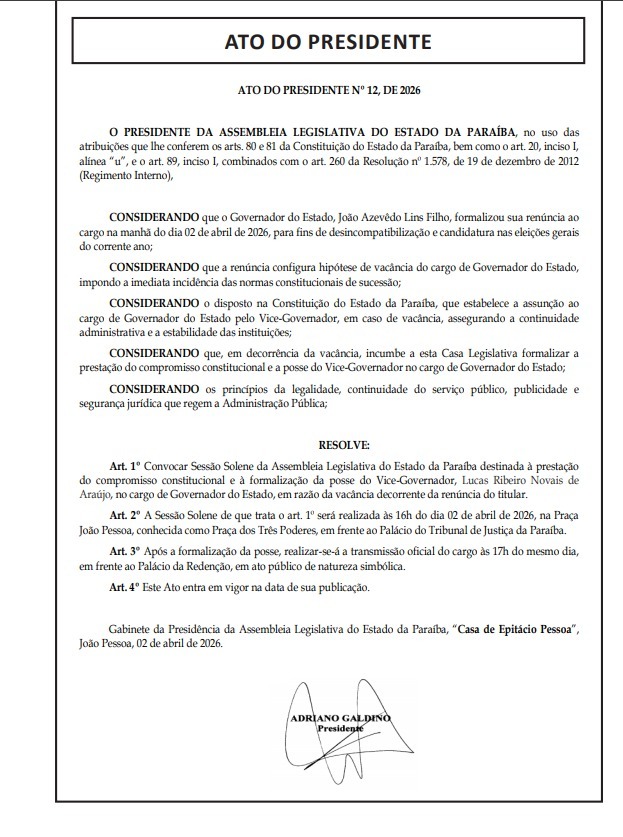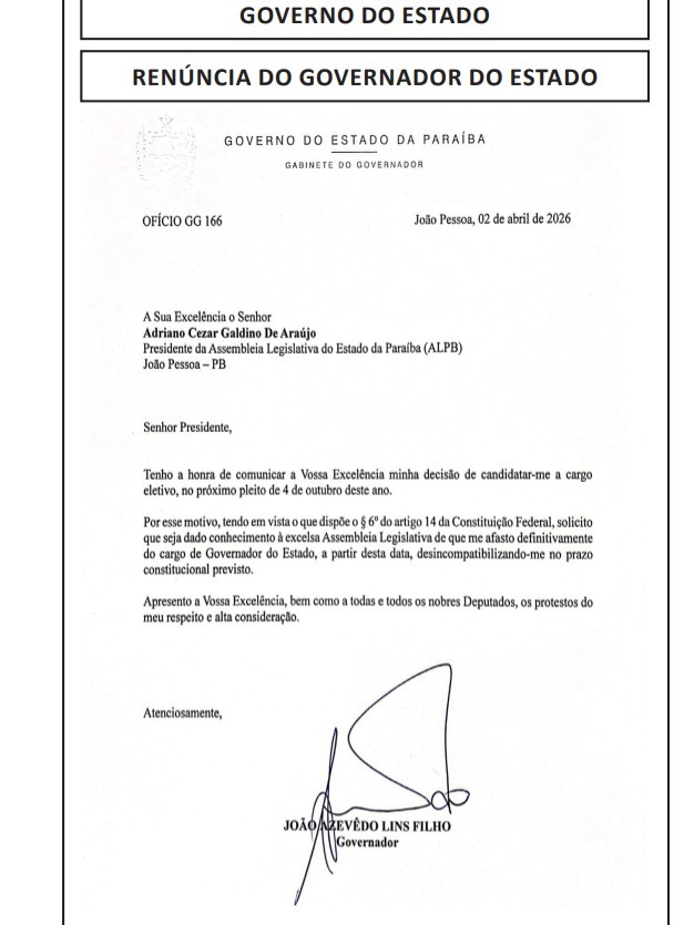 João Azevêdo formalizou a renúncia à função de governador e o presidente da Assembleia Legislativa da Paraíba (ALPB) convocou sessão solene para dar posse a Lucas Ribeiro no cargo e a transmissão do cargo. As cerimônias acontecerão ainda nesta quinta-feira (2), na Praça dos Três Poderes, no Centro de João Pessoa.