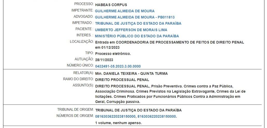 A ministra da Quinta Turma do Superior Tribunal de Justiça (STJ), Daniela Teixeira, concedeu liminar, nesta sexta-feira (01), em favor do prefeito de São Mamede, Umberto Jefferson de Morais Lima, após sua defesa impetrar com pedido de Habeas Corpus contra decisão do Tribunal de Justiça da Paraíba que o afastou do cargo e impôs medidas cautelares. Com isso, a ministra derruba a decisão monocrática do desembargador Márcio Murilo da Cunha Ramos e determinou a volta dele ao cargo após três meses afastado.