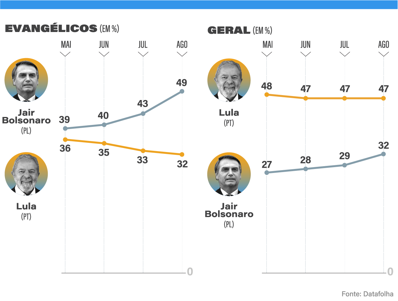 O presidente entendeu o peso que as igrejas podem ter na busca pela reeleição e, desde julho, centrou boa parte de seus esforços nos evangélicos. Foi a eventos como a Marcha para Jesus, em São Paulo, Rio e Manaus, e escalou a primeira-dama, Michelle, que é evangélica, para falar diretamente com as mulheres (58% do nicho religioso e que têm rechaçado o presidente de forma mais acentuada que os homens). Por fim, temperou os pedidos de votos apostando na narrativa que o impulsionou há quatro anos: ele é o bem, Lula, o mal.