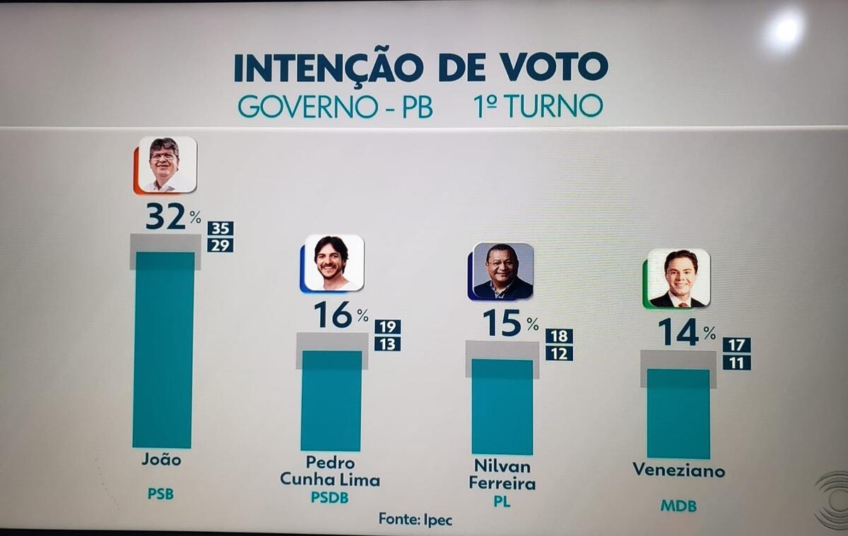 Em seguida, levando-se em conta a margem de erro de três pontos percentuais (para mais ou para menos), há um empate técnico entre os três nomes que disputam a 2ª colocação: Pedro Cunha Lima (PSDB), que tem 16%, seguido de perto por Nilvan Ferreira (PL), com 15%, e Veneziano Vital (MDB), com 14% das intenções de voto.