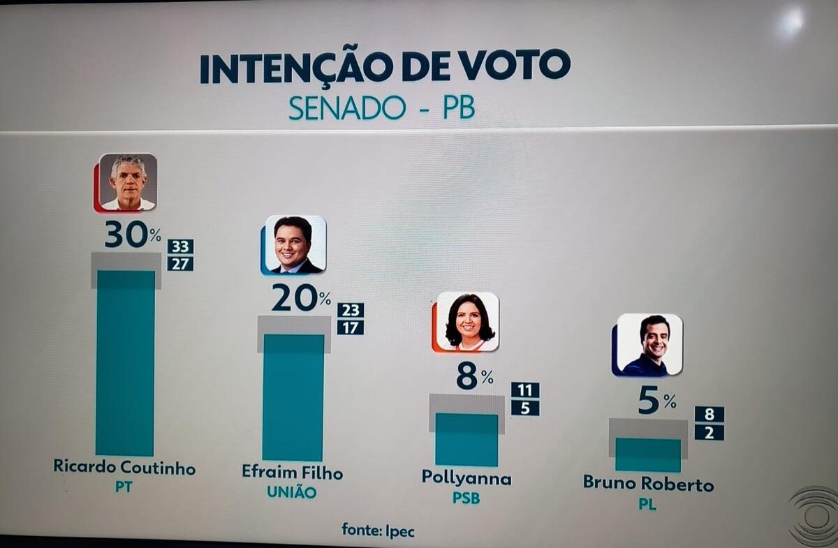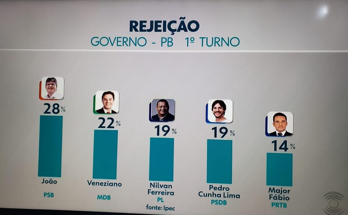 Em seguida, Pedro Cunha Lima, do PSDB, com 8%. Na sequência, Veneziano, do MDB, com 6%. Adjany Simplício (PSOL), Adriano Trajano (PCO) e Major Fábio (PRTB) e Nascimento (PSTU) não foram citados.
