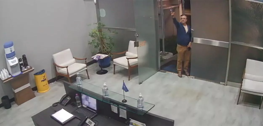 No vídeo, Barbieri aparece conversando com um homem na porta do diretório. Pouco depois, o homem entra no local e o deputado saca a arma e efetua um disparo para o alto, saindo do lugar logo em seguida.