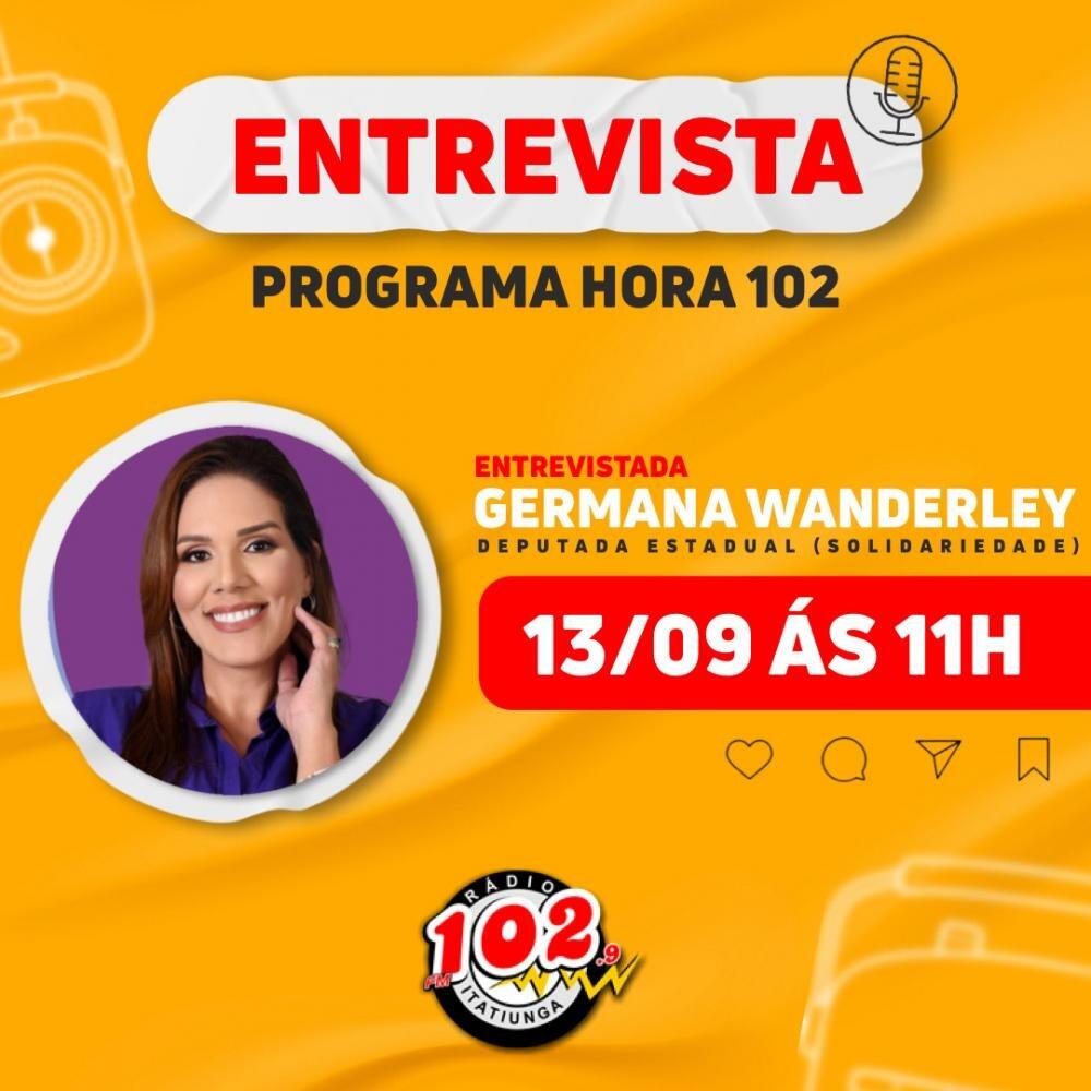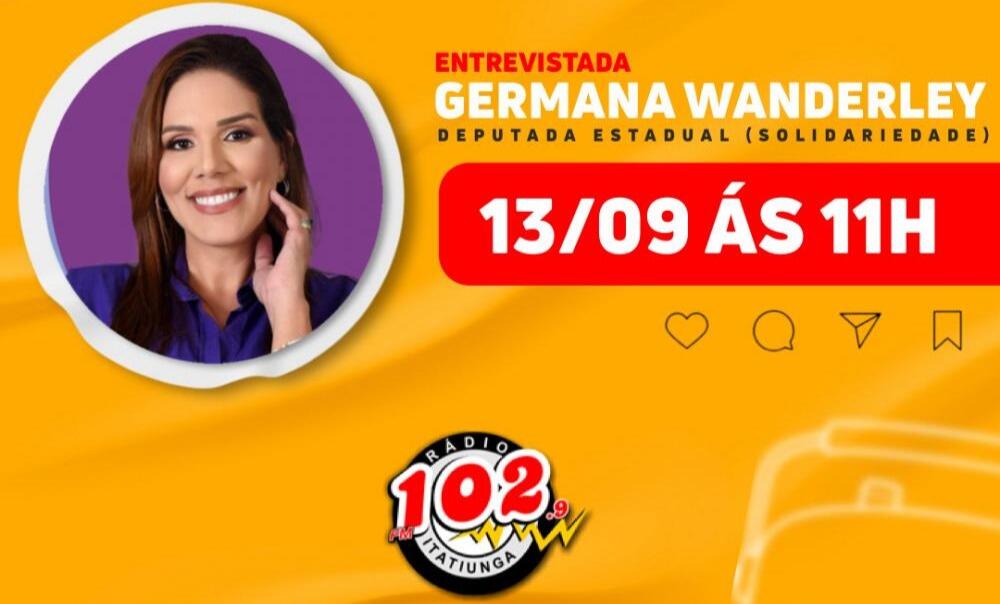 Nesta terça-feira (13) o Sistema Itatiunga de Comunicação – formado pelas Rádios Itatiunga FM 102,9 e Sertão AM 1450 KHz – fará sabatina com a candidata a deputada estadual, Germana Wanderley (SOLIDARIEDADE).