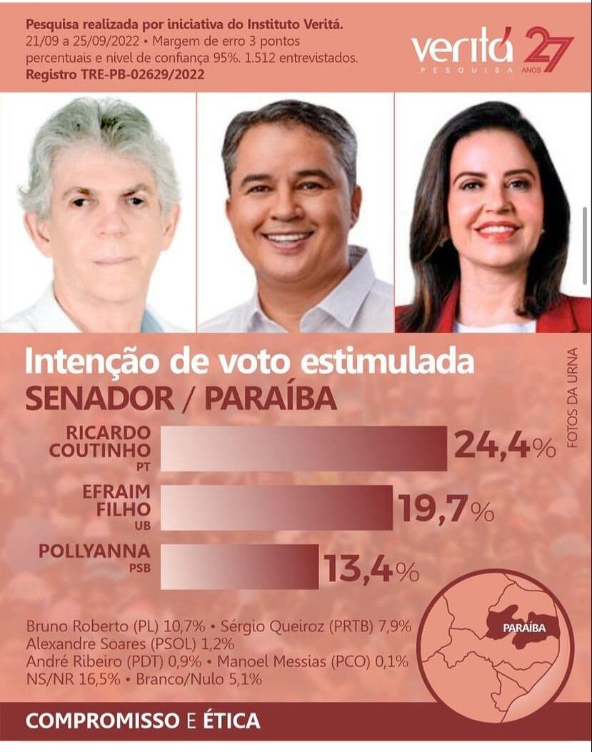 A pesquisa do Instituto Veritá, na semana da eleição, aponta Ricardo Coutinho (PT) na liderança da disputa para Senado na Paraíba, com 24,4% das intenções de voto. Seguido por Efraim Filho (UB) com 19,7% e Pollyanna (PSB), com 13,4%.