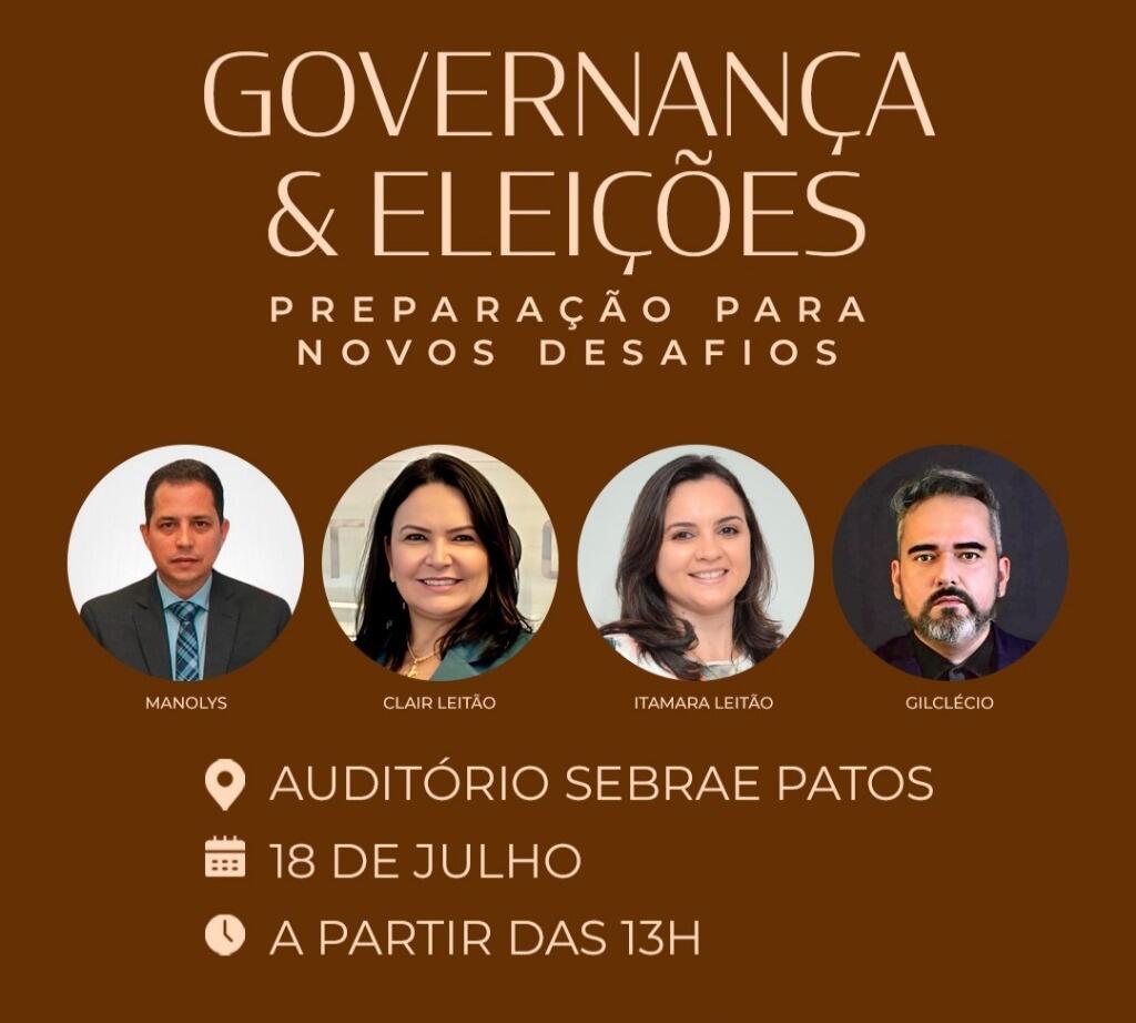 A cidade de Patos será palco para realização do evento Governança & Eleições: Preparação para os Novos Desafios, organizado pela Empresa Clair & Leitão Contabilidade Pública, que acontece nesta quinta-feira, dia 18 de julho, às 13h, no Auditório do Sebrae Patos.