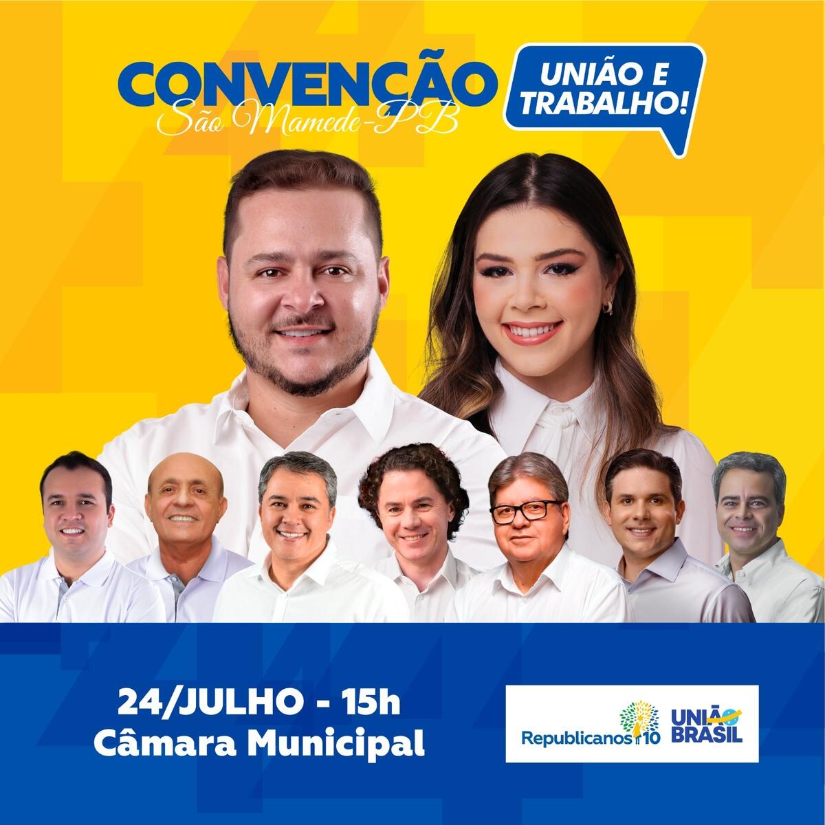 Os partidos União Brasil e Republicanos do município de São Mamede farão convenção partidária conjunta, nesta quarta-feira, dia 24 de julho, quando homologarão as candidaturas a prefeito de Chaguinha, e da vice-prefeita, Bia, além dos candidatos a vereador do grupo. O evento acontecerá na Câmara de Vereadores, a partir das 15h.